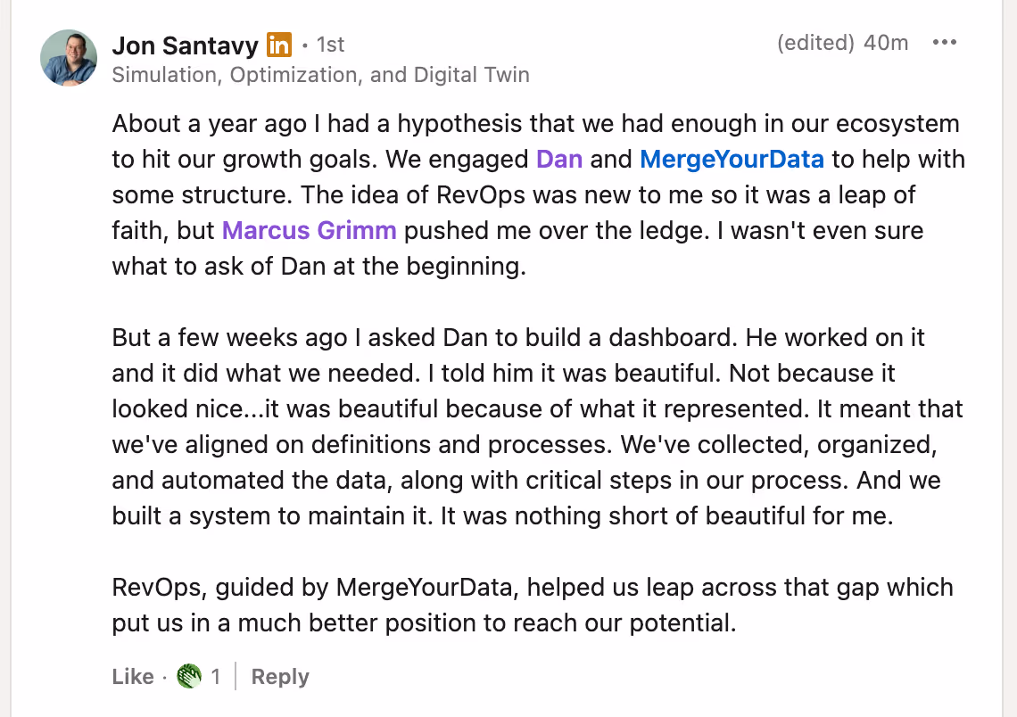 MergeYourData was founded in 2019 by Dan Saavedra to solve exactly that. After a career in data and systems architecture at Siemens Energy and FIS, Dan saw the same story on repeat: companies investing in tools like HubSpot but never getting the return.